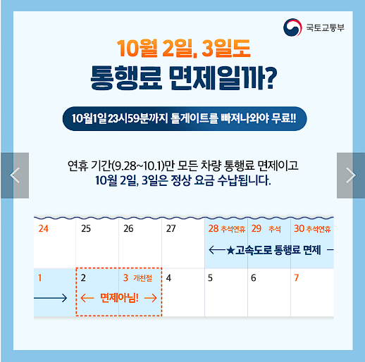 10월 1일 11시 59분까지 톨케이트를 빠져나와야 톨비가 무료입니다. 즉, 9월 28일 부터 10월 1일까지만 모든 차량 통행료 면제이고 10월 2일, 3일은 정상 요금 수납되니 참고하시길 바랍니다.